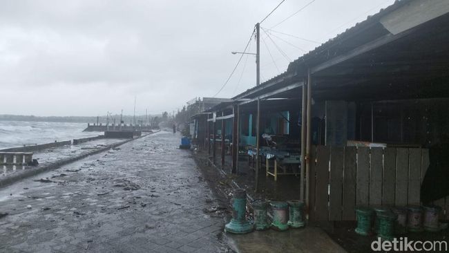 Warga setempat, Masnah, mengatakan semua warga yang memiliki kios di tepi Pantai Jempol tidak bisa berjualan karena kondisi cuaca buruk.