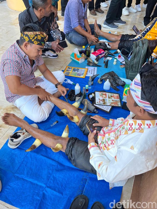 Dari pantauan detikBali, perlengkapan Cak Dul terdiri dari tanduk sapi, minyak urut, serta jarum kecil yang dimasukkan ke dalam toples.