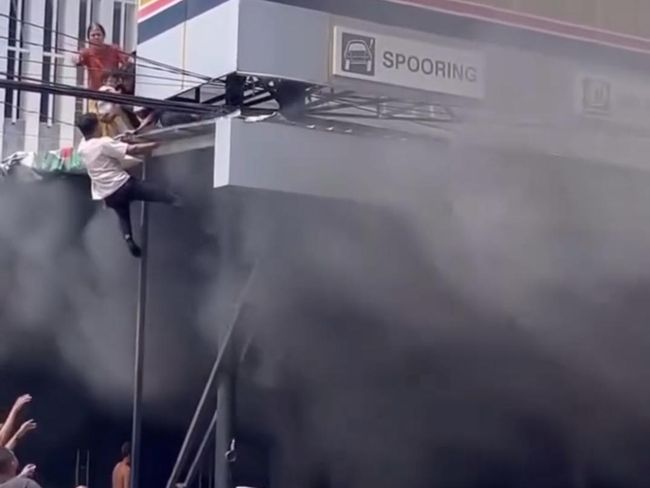Dalam video yang beredar, terlihat dua pria langsung memanjat tiang untuk naik ke lantai dua. Sementara di bawah mereka, api dan asap terus membesar.