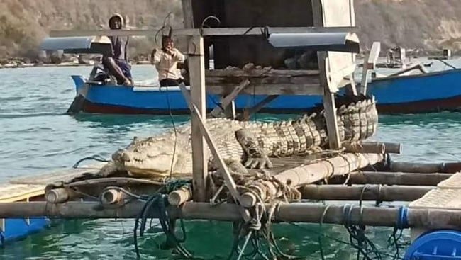 Seorang nelayan bernama Suriadi dikejutkan dengan penampakan seekor buaya muara berukuran besar berjemur di keramba lobster miliknya di Pantai Bumbang, Desa Mertak, Kecamatan Pujut, Lombok Tengah, NTB. Buaya itu berjemur tengah hari di atas tambak.