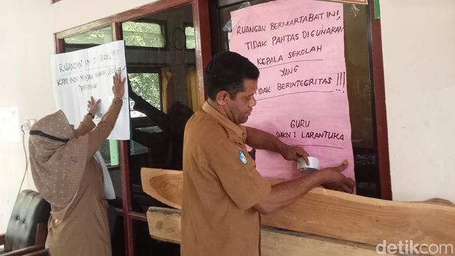 Belasan guru SMKN 1 Larantuka menyegel ruangan kepala sekolah (kepsek) pada Senin (7/10/2024). Mereka menuntut Kepala SMKN 1 Larantuka, Lusia Yasinta Tuti Fernandez, dinonaktifkan dari jabatannya. Para guru juga meminta kejaksaan agar mengusut dugaan korupsi dana Bantuan Operasional Sekolah (BOS) senilai Rp 321 juta oleh kepsek.