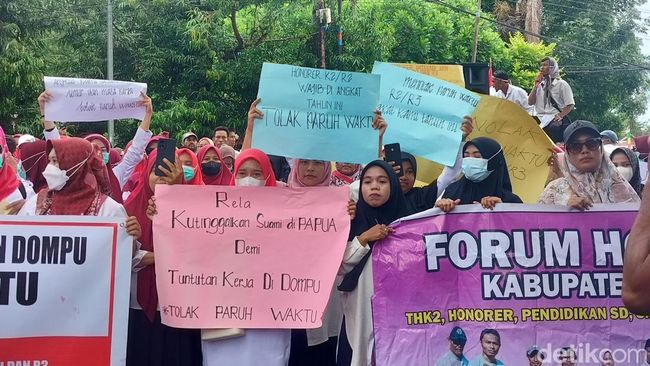 Ratusan tenaga honorer di Kabupaten Dompu, Nusa Tenggara Barat (NTB), menolak wacana pemerintah untuk menjadikan mereka sebagai Pegawai Pemerintah dengan Perjanjian Kerja (PPPK) paruh waktu. Penolakan tersebut disampaikan dalam aksi unjuk rasa di depan gedung DPRD Dompu, Rabu (22/1/2025).