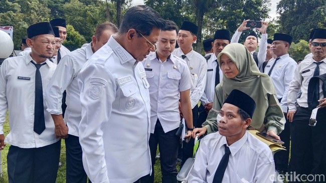 Abdul Hayyi (46), warga Desa Wanasaba, Kecamatan Wanasaba, Lombok Timur, Nusa Tenggara Barat (NTB), rela meminjam kursi roda demi menerima langsung surat keputusan (SK) pengangkatan sebagai Pegawai Pemerintah dengan Perjanjian Kerja (PPPK) di halaman Kantor Bupati Lombok Timur, Rabu (30/4/2025).