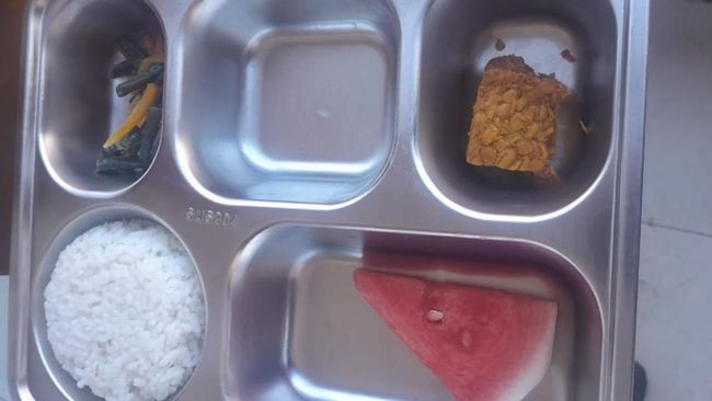 Dari foto yang dilihat detikBali, dalam satu porsi menu MBG untuk setiap siswa, ada nasi, tumis sayur kacang, sepotong kecil tempe goreng, dan sepotong semangka.