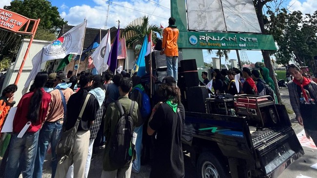 Ratusan Mahasiswa Pencinta Alam (Mapala) menggelar aksi demonstrasi di depan kantor Balai Taman Nasional Gunung Rinjani (TNGR), Mataram, Nusa Tenggara Barat (NTB), Rabu (9/7/2025). Mereka menolak rencana pembangunan proyek Seaplane dan Glamping di kawasan Danau Segara Anak, Taman Nasional Gunung Rinjani.