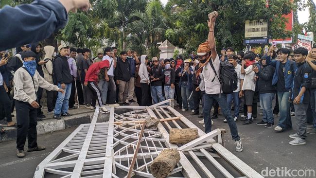 Massa aksi juga sempat melempar botol dan kayu saat polisi berupaya memadamkan api keranda yang dibakar. Mereka lantas merangsek masuk ke halaman gedung dewan.