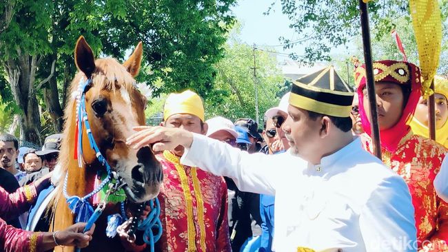 Pasangan petahana, Kader Jaelani dan Syahrul Parsan (AKJ-SYAH), menaiki kuda dan memakai baju adat saat mendaftar Pemilihan Bupati (Pilbup) 2024 ke Komisi Pemilihan Umum (KPU) Dompu, Rabu (28/8/2024). Kader dan Syahrul menunggangi kuda jantan berwarna cokelat saat itu.