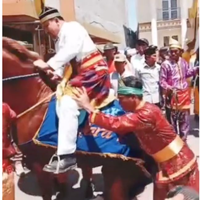 Kader Jaelani terjatuh tepat di hadapan ribuan massa pendukung di depan rumahnya. Dalam video yang beredar itu, Kader yang berpakaian adat, terlihat naik ke atas kuda.