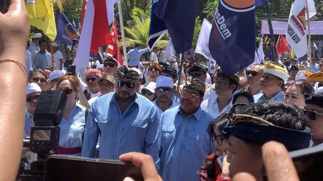 Alunan musik baleganjur dan okokan turut mengiringi pasangan calon gubernur dan wakil gubernur Bali dari Koalisi Indonesia Maju (KIM), Made Muliawan Arya alias (De Gadjah) dan Putu Agus Suradnyana (PAS), ke Komisi Pemilihan Umum (KPU) Bali, Kamis (29/8/2024). Ribuan massa ikut menemani kandidat De Gadjah-PAS saat mendaftar Pemilihan Gubernur (Pilgub) Bali 2024.