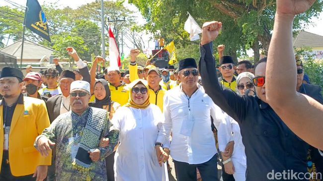 Bakal pasangan calon bupati dan wakil bupati Lombok Barat Sumiatun dan Ibnu Salim diantar ribuan pendukung saat mendaftar ke kantor Komisi Pemilihan Umum (KPU) Lombok Barat, Kamis siang (29/8/2024). Pasangan Sumiatun-Ibnu Salim ini menjadi pendaftar terakhir di Pilkada Lombok Barat 2024.