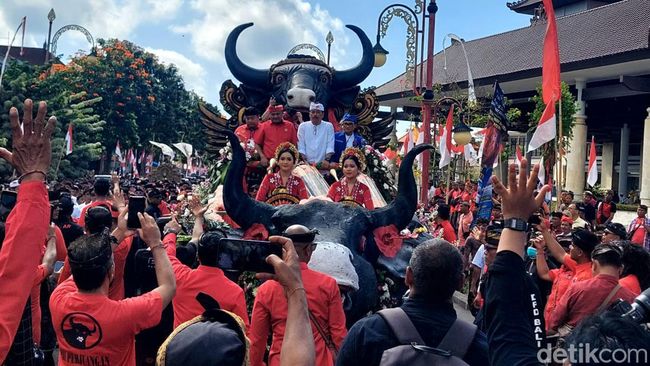 Pantauan detikBali, Agus Mahayastra dan Gung Mayun naik kendaraan yang dihias menyerupai kepala banteng saat menuju kantor KPU Gianyar. Pendaftaran berkonsep parade budaya itu melibatkan sebanyak 450 sekaa baleganjur dan gamelan gambang. Iring-iringan Paket Aman tersebut berangkat dari titik kumpul di Lapangan Astina, Gianyar.