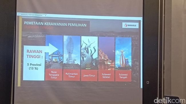 Badan Pengawas Pemilu (Bawaslu) telah melakukan pemetaan 37 provinsi di Indonesia yang masuk dalam rawan Pilkada 2024. Provinsi Nusa Tenggara Timur (NTT) menempati urutan pertama sebagai provinsi dengan tingkat kerawanan pilkada paling tinggi. Pemetaan ini berdasarkan hasil Indeks Kerawanan Pemilihan dan Hasil Pengawasan Pemilu Tahun 2024.