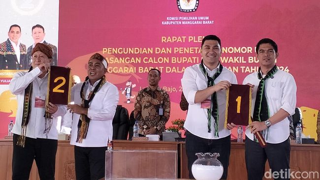 Pengundian nomor urut paslon dilaksanakan di Komisi Pemilihan Umum (KPU) Manggarai Barat, Senin (23/9/2024). Pengundian nomor urut dihadiri kedua paslon, pimpinan partai pengusung, dan sejumlah pendukung.