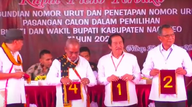 Komisi Pemilihan Umum (KPU) Nagekeo, Nusa Tenggara Timur (NTT), menetapkan nomor urut empat pasangan calon (paslon) bupati-wakil bupati Nagekeo 2024. Pengundian dan penetapan nomor urut dilaksanakan di kantor KPU Nagekeo, Senin (23/9/2024).