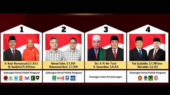 Muhammad Nasir meraih 68 persen (popularitas), 61,9 persen (akseptabilitas), dan 48,7 persen (kapabilitas). Selanjutnya, Ahmad Salim 61,8 persen (popularitas), 59,9 persen (akseptabilitas), dan 46,6 persen (kapabilitas). Terakhir, Sumardhan meraih 57 persen (popularitas), 57,7 persen (akseptabilitas), dan 46,3 persen (kapabilitas).
