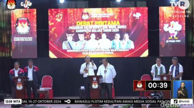 Debat perdana Pilbup Malaka 2024 dihadiri tiga pasangan calon. Yakni, nomor urut 1 Simon Nahak- Felix Bere Nahak, pasangan nomor urut 2 Stefanus Bria Seran-Hendri Melki Simu, serta pasangan nomor urut 3 Louise Lucky Taolin-Eduardus Bere Atok.