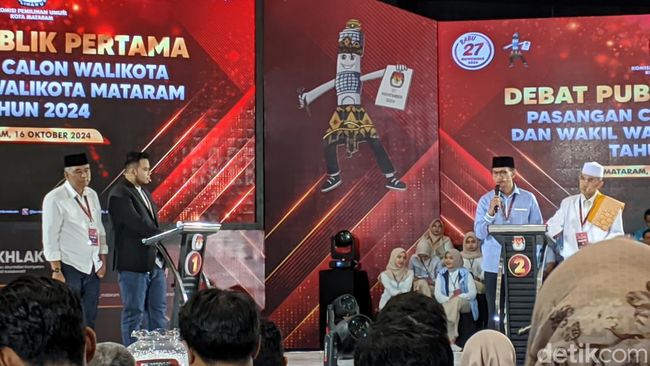 Debat calon wali kota dan wakil wali kota Mataram digelar Rabu (17/10/2024) malam. Pasangan Lalu Aria Dharma dan Weis Arqurnain (Aqur) membeberkan sejumlah janji jika terpilih dalam Pemilihan Wali Kota (Pilwalkot) Mataram 2024.