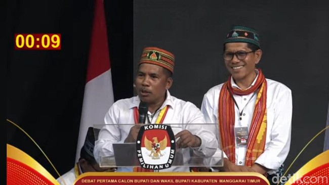 Pasangan calon (paslon) bupati-wakil bupati Manggarai Timur, Nusa Tenggara Timur (NTT), Siprianus Habur-Lucius Modo (Harum) memaparkan lima program prioritas dalam debat perdana Pilbub Manggarai Timur 2024, Selasa (22/10/2024).