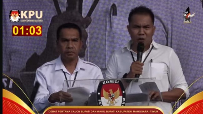Calon bupati-wakil bupati Manggarai Timur nomor urut 3 Selphyanus Tovin-Frumensius Fredrik Anam (Elemen), membeberkan sejumlah program saat debat perdana Pemilihan Bupati (Pilbup) Manggarai Timur. Berbagai program kerja yang dijanjikan duet Elemen itu terkait penguatan ekonomi lokal hingga penanganan orang dengan gangguan jiwa (ODGJ).