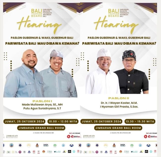 Asosiasi pariwisata Bali yang tergabung dalam Bali Tourism Board (BTB) menggelar acara bertajuk 'Hearing: Pariwisata Bali Mau Dibawa ke Mana?' pada 25 Oktober 2024, dengan menghadirkan para calon gubernur (cagub) Bali. Acara bertujuan untuk membahas permasalahan serta solusi di bidang pariwisata Bali.