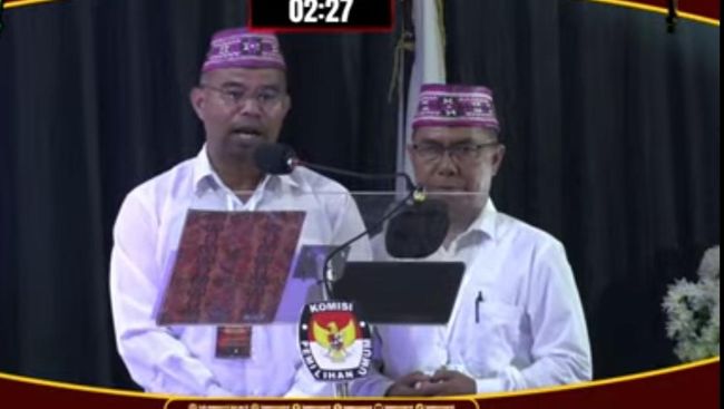 Pasangan calon bupati-wakil bupati Manggarai, Nusa Tenggara Timur (NTT), Yohanes Halut-Thomas Dohu (Yohan-Thomas) menyampaikan visi-misi dalam debat publik yang digelar Komisi Pemilihan Umum (KPU) Manggarai, Rabu (30/10/2024). Debat itu disiarkan langsung melalui kanal YouTube KPU Manggarai.