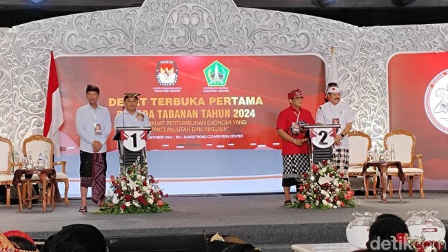 Debat perdana Pilbup Tabanan 2024 digelar pada Kamis (31/10/2024) malam di Bali Sunset Road Conventions Centre, Denpasar. Adapun tema debat perdana yang digelar KPU Tabanan adalah 'Memperkuat Pertumbuhan Ekonomi yang Berkelanjutan'. Debat kedua rencananya akan digelar pada 13 November dan debat terakhir pada 20 November 2024.