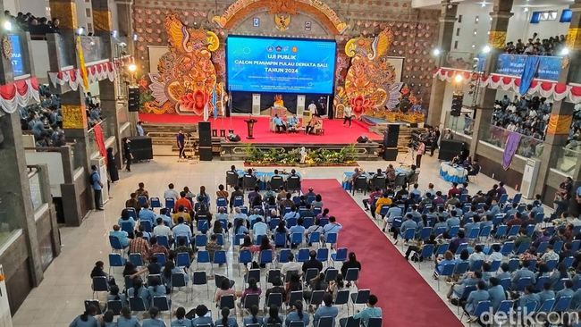 Badan Eksekutif Mahasiswa (BEM) Republik Mahasiswa (Rema) Universitas Pendidikan Ganesha (Undiksha) Singaraja menggelar uji publik calon gubernur (cagub) dan calon wakil gubernur (cawagub) Bali nomor urut 1 Made Muliawan Arya alias De Gadjah dan Putu Agus Suradnyana (Mulia-PAS), Selasa (5/11/2024). Ribuan mahasiswa dari berbagai fakultas tampak memenuhi auditorium di Kampus Tengah Undiksha Singaraja.