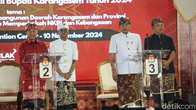KPU menggelar debat terbuka ketiga pasangan calon (paslon) Pemilihan Bupati (Pilbup) Karangasem 2024. Debat digelar di Bali Sunset Road Conventions Center Denpasar, Minggu malam (10/11/2024).