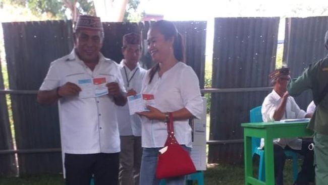 Calon bupati Manggarai Barat Edistasius Endi mencoblos di tempat pemungutan suara (TPS) 10, Kelurahan Wae Kelambu, Labuan Bajo, Manggarai Barat, NTT, Rabu (27/11/2024). Edi Endi didampingi istrinya.