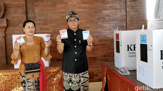 Pantauan detikBali, Giri tiba di lokasi pencoblosan di Banjar Adat Pelaga, Desa Pelaga, Kecamatan Petang, Badung, sekitar pukul 9.30 Wita. Giri terlihat ditemani istri, Ni Kadek Seniasih.