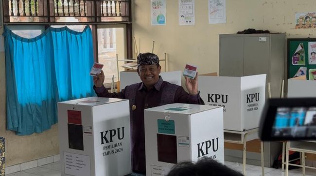 Penjabat (Pj) Gubernur Bali, Sang Made Mahendra Jaya, menyalurkan hak suaranya di Tempat Pemungutan Suara (TPS) 5 di Sekolah Dasar Negeri (SDN) 14 Dangin Puri, Denpasar. Mahendra datang pukul 10.15 Wita seusai melakukan monitoring dan supervisi di beberapa TPS di Denpasar.