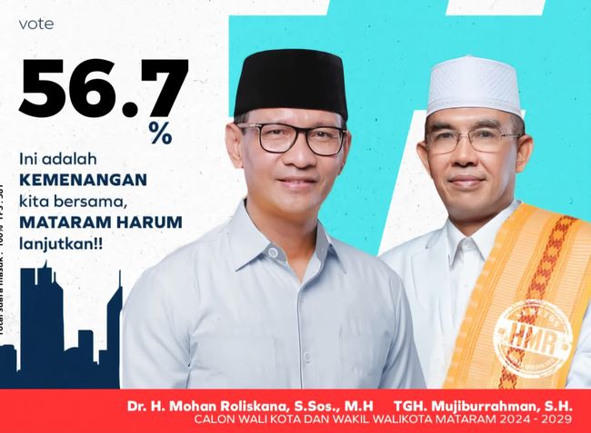 Pasangan petahana Mohan Roliskana-TGH Mujiburrahman (HARUM), unggul versi real count internal di Pemilihan Wali Kota (Pilwalkot) Mataram 2024. Pasangan nomor urut 2 itu unggul 56,7 persen atau sekitar 113.027 suara.