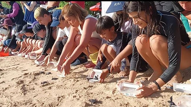 Mereka menantikan pelepasan ratusan ekor anak tukik yang dikomandoi oleh karyawan Hotel Mercure, Kuta.