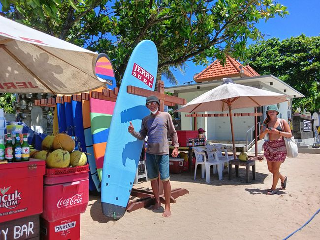 Lain halnya I Nyoman Darsa (51) pria asli Kuta dari Jery Bar ini mengaku sudah 10 tahun mengembangkan usaha papan selancar dan jasa kursus surfing. Menurutnya dibandingkan tahun 2019, saat ini tingkat kunjungan boleh dikatakan sepi.