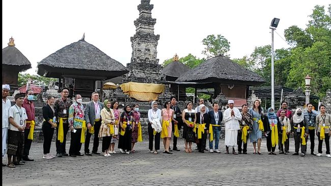 Sebelum masuk ke area Pura Dalem Sakenan, mereka terlebih dahulu dipakaikan selendang berwarna kuning yang diikat di pinggang. Usai itu, para delegasi bersama tim Kementerian PPN/Bappenas kemudian foto bersama di depan pintu masuk pura.