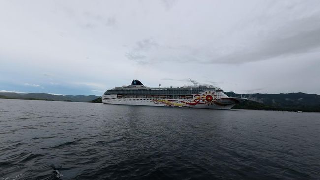 Kapal pesiar Motor Ship (MS) Norwegian Sun bersandar di perairan Taman Nasional Komodo, Manggarai Barat, Nusa Tenggara Timur (NTT), Sabtu (15/3/2025). Kapal tersebut mengangkut 1.633 wisatawan mancanegara (wisman) dan 895 kru.