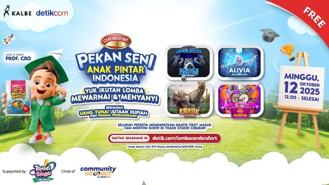 Menariknya, lomba-lomba ini menghadirkan hadiah jutaan rupiah, piala, dan sertifikat. Bertempat di Trans Studio Cibubur pada 12 Oktober 2025, kegiatan ini juga bisa menjadi wadah bagi anak-anak untuk mengasah kreativitas sambil bermain dan melakukan kegiatan edukatif lainnya.