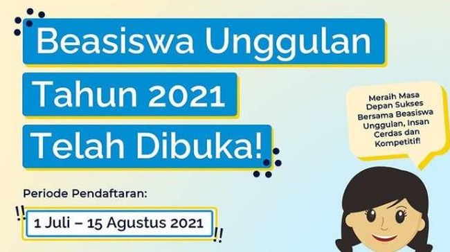 "Sobat Beasiswa Unggulan dapat mendaftarkan diri melalui laman puslapdik.kemdikbud.go.id mulai tanggal 1 Juli-15 Agustus 2021," tulis Pusat Layanan Pembiayaan Pendidikan (Puslapdik) di Instagram puslapdik_dikbud.