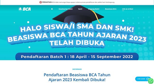 Pendaftaran beasiswa BCA 2023 dibuka di laman https://karir.bca.co.id/beasiswa-bca. Semoga berhasil!
