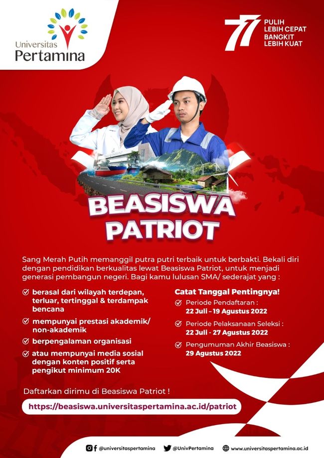 Selengkapnya tentang beasiswa kuliah di Universitas Pertamina 2022 Beasiswa Patriot bisa diakses di laman https://beasiswa.universitaspertamina.ac.id/patriot. Semoga berhasil, detikers!