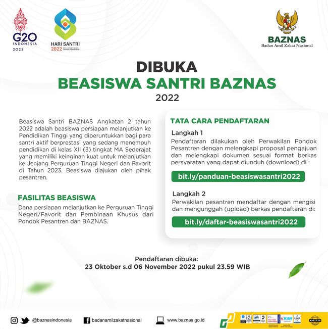 Badan Amil dan Zakat Nasional (BAZNAS) resmi membuka pendaftaran Beasiswa Santri angkatan 2 tahun 2022. Pendaftaran dibuka hingga 6 November untuk 2.500 santri terpilih.