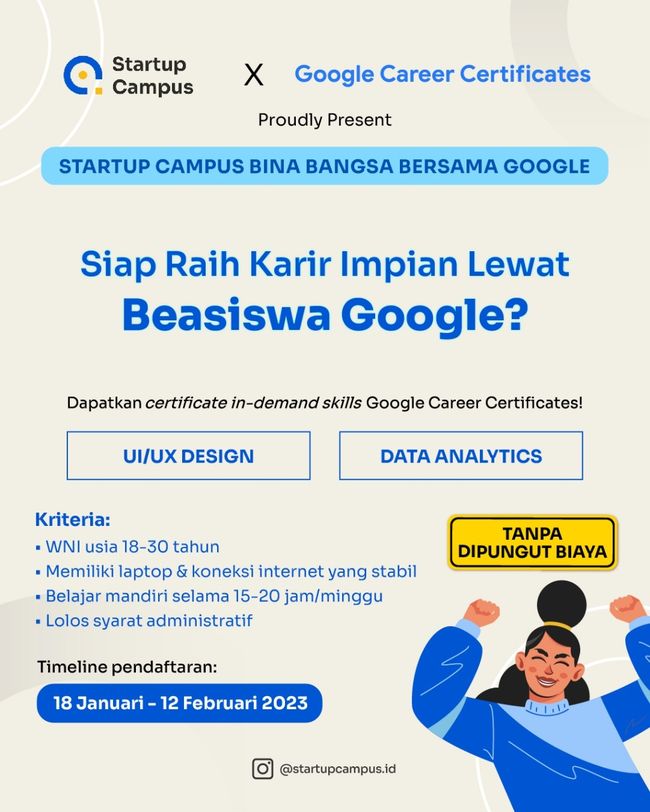 Google bekerja sama dengan Startup Campus membuka program Startup Campus Bina Bangsa bersama Google. Program ini akan memberikan beasiswa Google Career Certificates kepada 300 peserta di Indonesia.