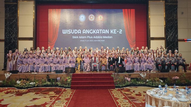 Sebanyak 141 siswa-siswi SMA Islam Plus Adzkia mengikuti prosesi wisuda angkatan kedua di Ballroom Adimulia Hotel, Medan, pada Minggu (11/6). Di momentum itu, Kepala Sekolah SMA Islam Plus Adzkia Fachrizal Barus memberikan beasiswa S1 luar negeri, umrah, dan sepeda motor, kepada wisudawan yang terpilih.
