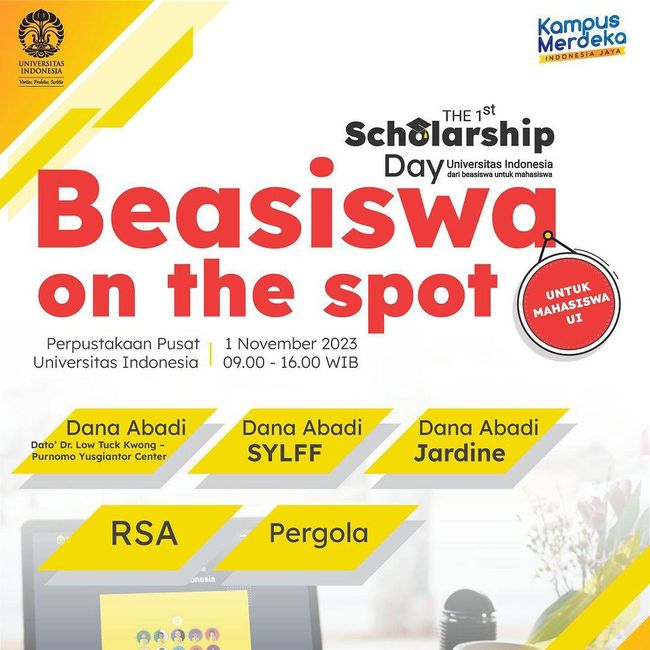 Universitas Indonesia (UI) mengadakan The 1st Scholarship Day untuk mahasiswanya pada tanggal 1 November 2023 pukul 09.00-16.00 WIB di Perpustakaan Pusat UI. Setidaknya ada 5 beasiswa yang dibuka dan bisa didaftarkan secara langsung, baik bagi jenjang sarjana atau pascasarjana.