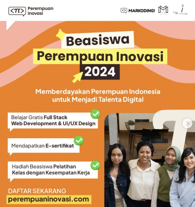 Program Perempuan Inovasi 2024 memberdayakan para perempuan Indonesia belajar ngoding gratis. Pendaftaran diperpanjang sampai 17 Mei 2024, begini cara daftarnya!
