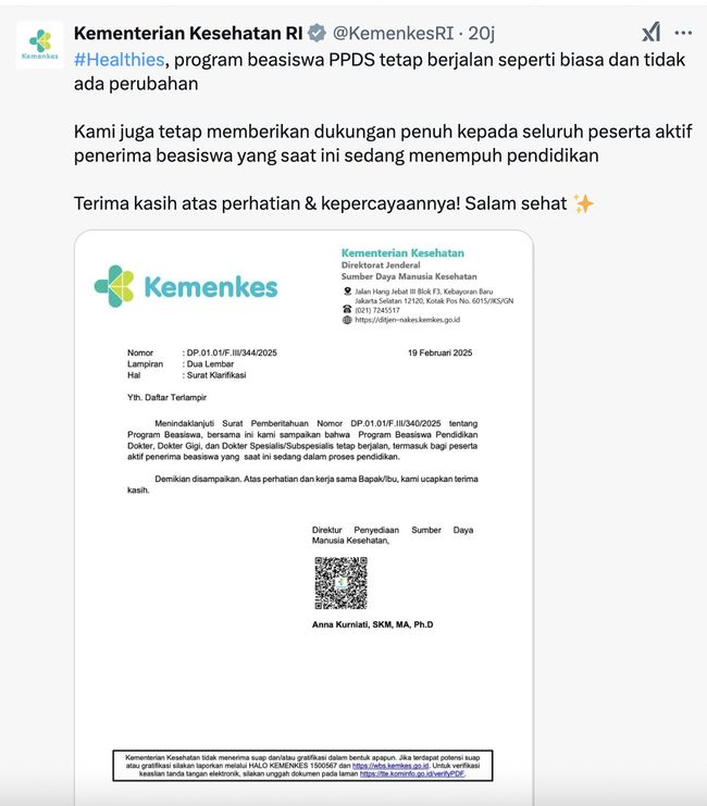 "#Healthies, program beasiswa PPDS tetap berjalan seperti biasa dan tidak ada perubahan. Kami juga tetap memberikan dukungan penuh kepada seluruh peserta aktif penerima beasiswa yang saat ini sedang menempuh pendidikan," demikian cuit akun X resmi Kemenkes, @KemenkesRI pada 19 Februari jam 19.17 WIB.