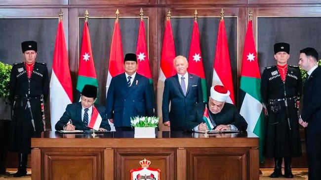 Nota kesepahaman kerja sama bidang pendidikan diteken Menteri Agama RI Nasaruddin Umar dan Menteri Agama RI Nasaruddin Umar dan Menteri Pendidikan Tinggi dan Riset Kerajaan Yordania Azmi Mahafzah, Senin (14/4/2025). Penandatanganan ini disaksikan Presiden RI Prabowo Subianto dan pemimpin Kerajaan Yordania Raja Abdullah II.