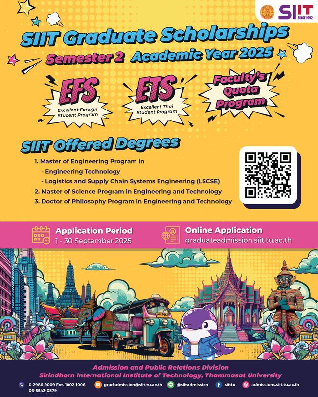 Beasiswa yang dibuka SIIT yaitu program pascasarjana untuk S2 (2 tahun) dan S3 (3 tahun). Beasiswa ini ditujukan untuk mahasiswa asing berprestasi atau Excellent Foreign Students/EFS (Tipe B).