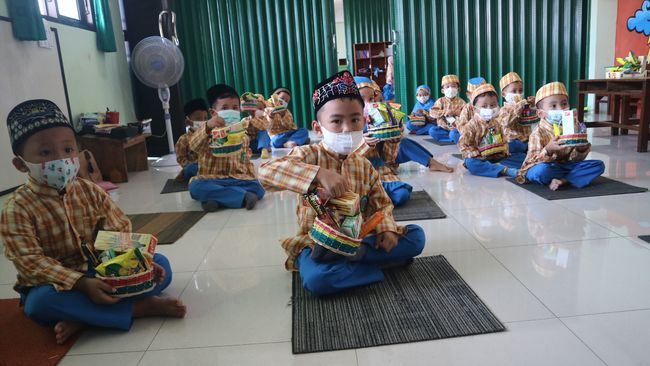 "Karena masa pandemi acara tidak banyak. Mulai dari anak masuk berdoa kemudian kita pandu untuk membaca al-berzanji bersama-sama terus setelah itu kita membagi secara antre untuk mengambil jajanan itu sendiri-diri. Anak diajarkan untuk antre dan mandiri," jelasnya.