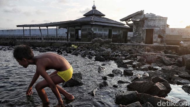 Tembok mushola yang masih tegak berdiri kini menjadi sarana bagi anak atau warga sekitar. Mereka bermain, mengambil gambar, atau mencari ikan di area sekitar Mushola Waladuna yang jadi 'korban' banjir rob Jakarta.